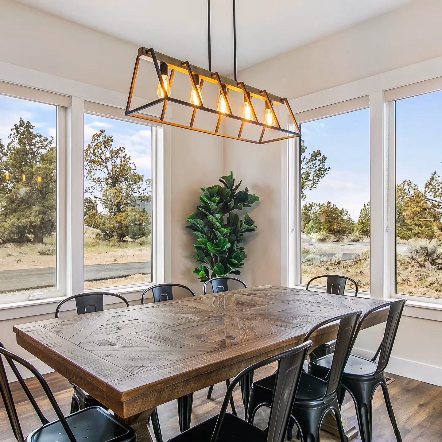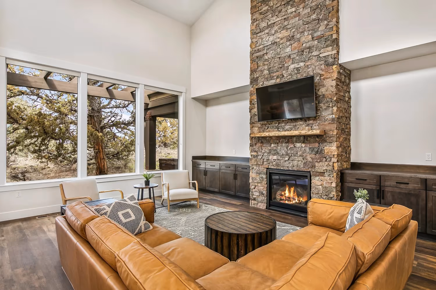 This custom-built home at Brasada Ranch, located in the picturesque Powell Butte golf community, embraces contemporary ranch house design. Clad in all cedar siding with dry stack stone and wood garage doors, the exterior offers timeless appeal. Inside, 25-ft vaulted ceilings and a stone fireplace create a cozy yet grand ambiance. The primary bathroom features a custom shower with a built-in bench, while the kitchen includes a walk-in pantry behind a barn door. Outdoor living spaces feature a cedar deck with a steel railing, a built-in hot tub, and even a golf cart charging station.