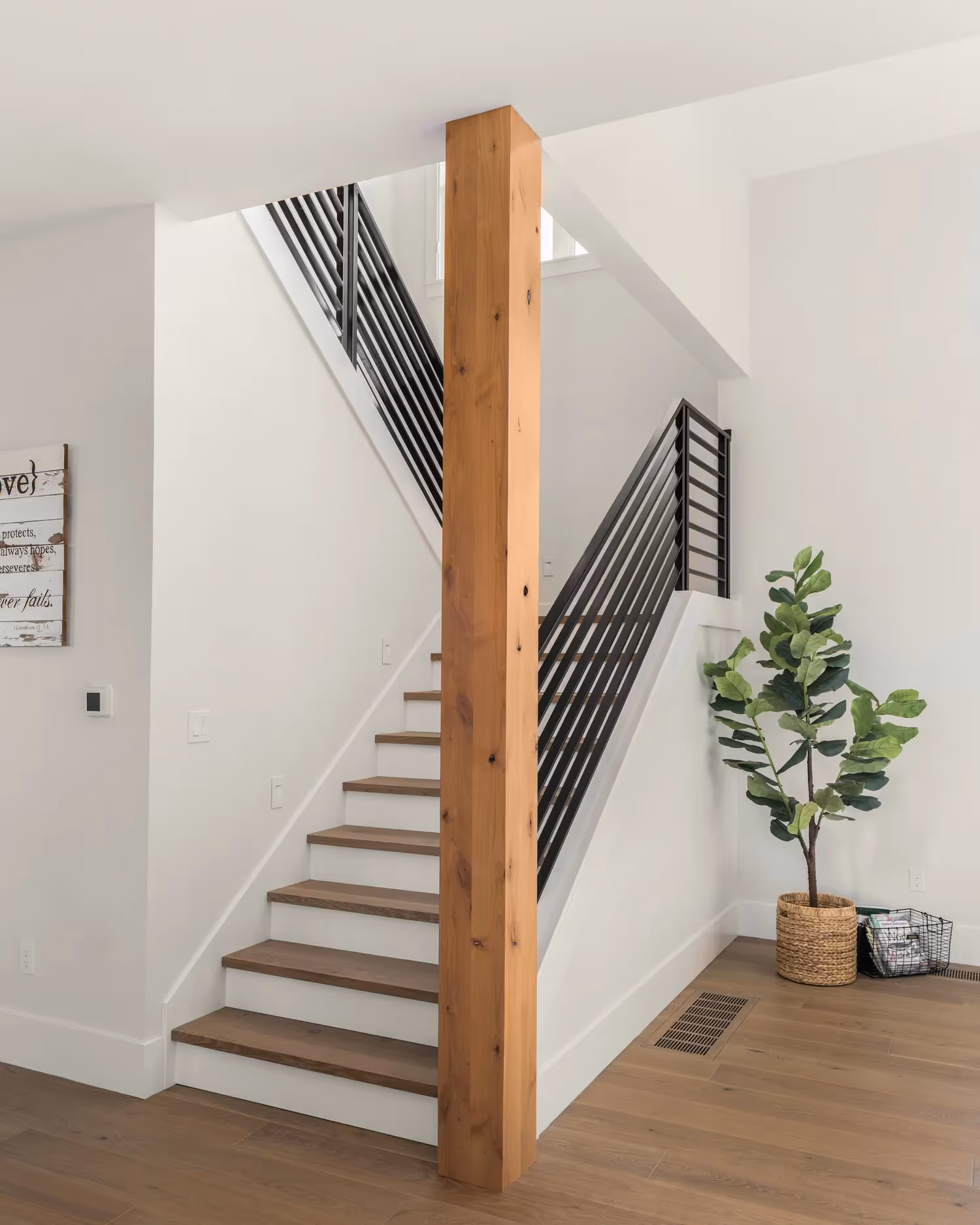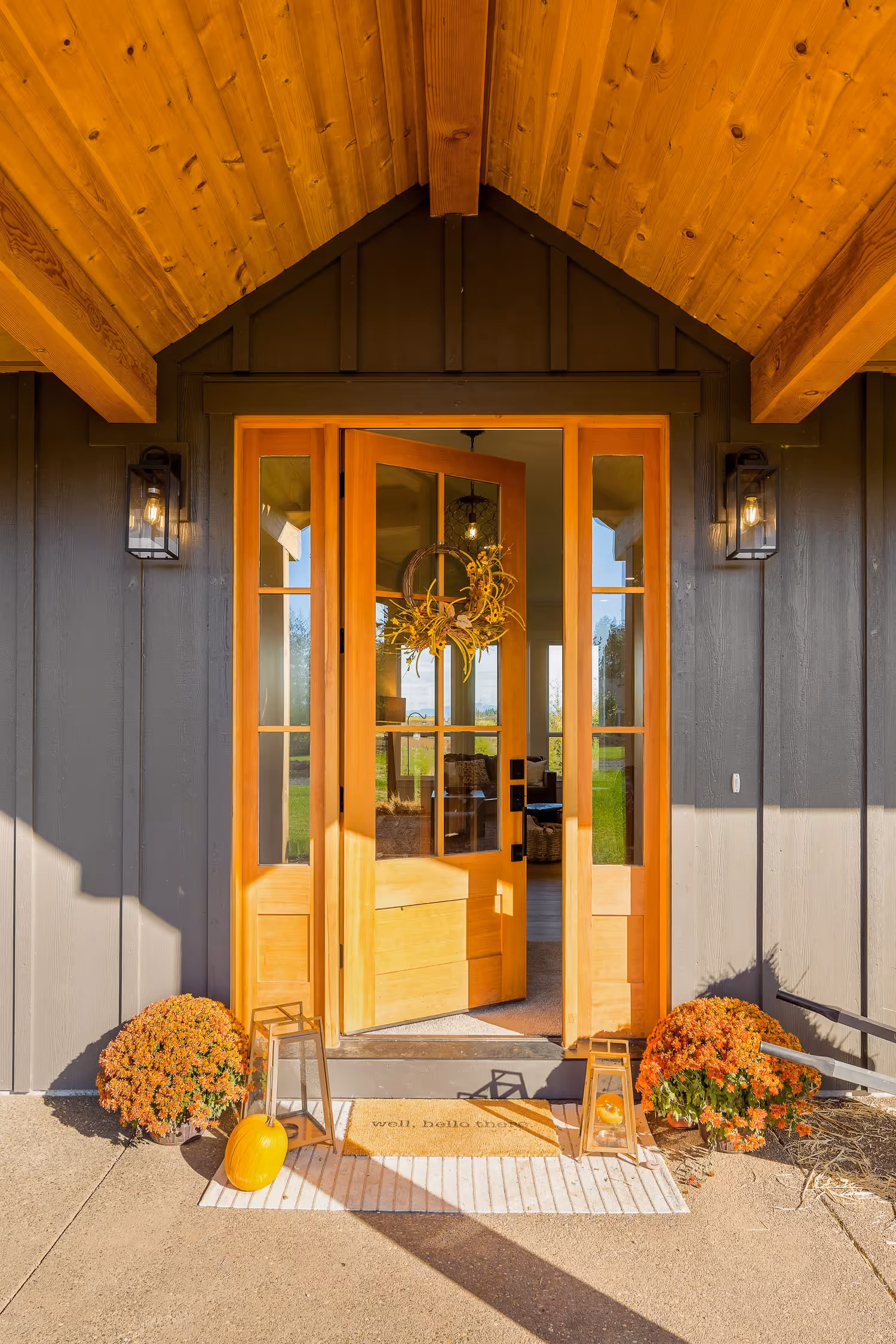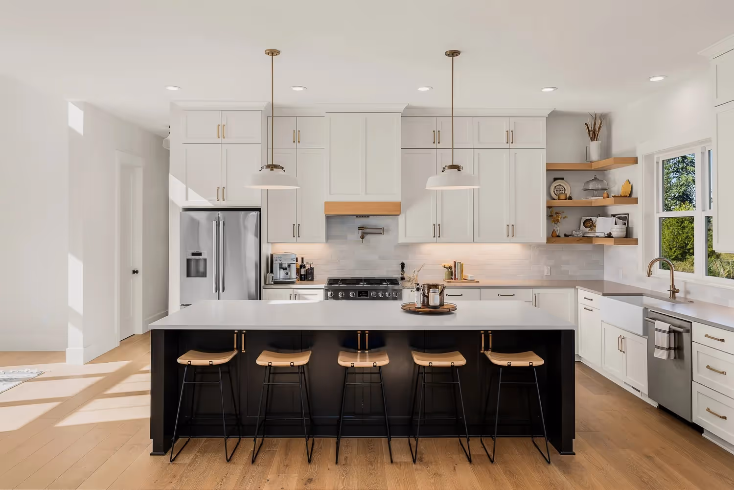 On a scenic nursery property in Boring, Oregon, this Modern Farmhouse combines traditional farmhouse charm with modern touches. The expansive patios and garage doors feature custom beamwork, with cedar tongue-and-groove ceilings creating an inviting exterior. Inside, painted cabinets reach the ceiling over a spacious 10-ft island with storage on both sides. A built-in fireplace is flanked by cabinets and floating shelves, adding warmth to the living area. Premium stainless appliances, a pot filler, farmhouse sink, and steel-fabricated stair railing further embody the farmhouse-meets-modern aesthetic.