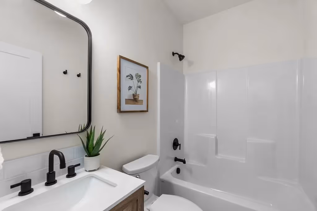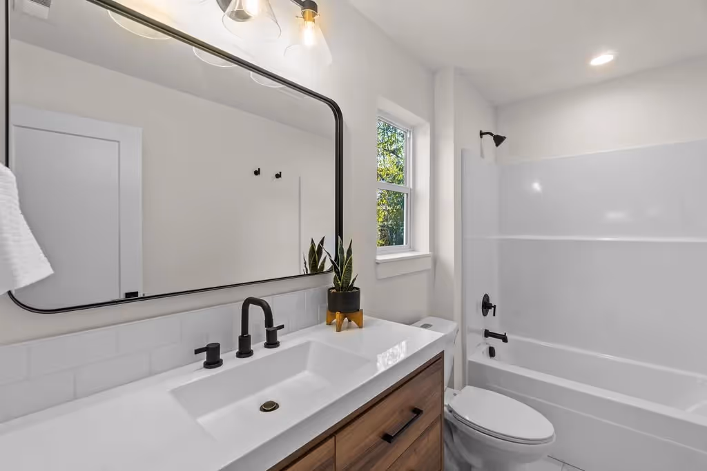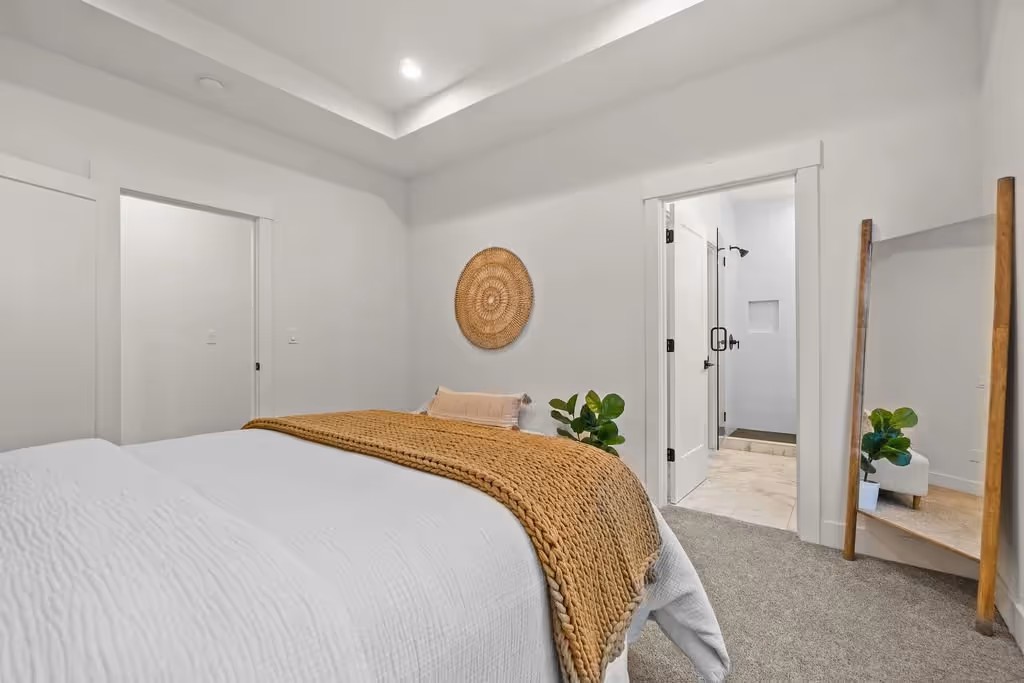 This custom spec home in Bend, Oregon, embodies classic craftsman style with contemporary touches. A spacious kitchen features a large farmhouse sink, custom cabinetry, and sleek stainless appliances, combining charm with modern convenience. The living area centers around a built-in gas fireplace framed by shiplap details, adding warmth and character. Standalone bathroom vanities with custom tile work elevate the bathrooms, completing this home’s blend of traditional design and modern functionality.