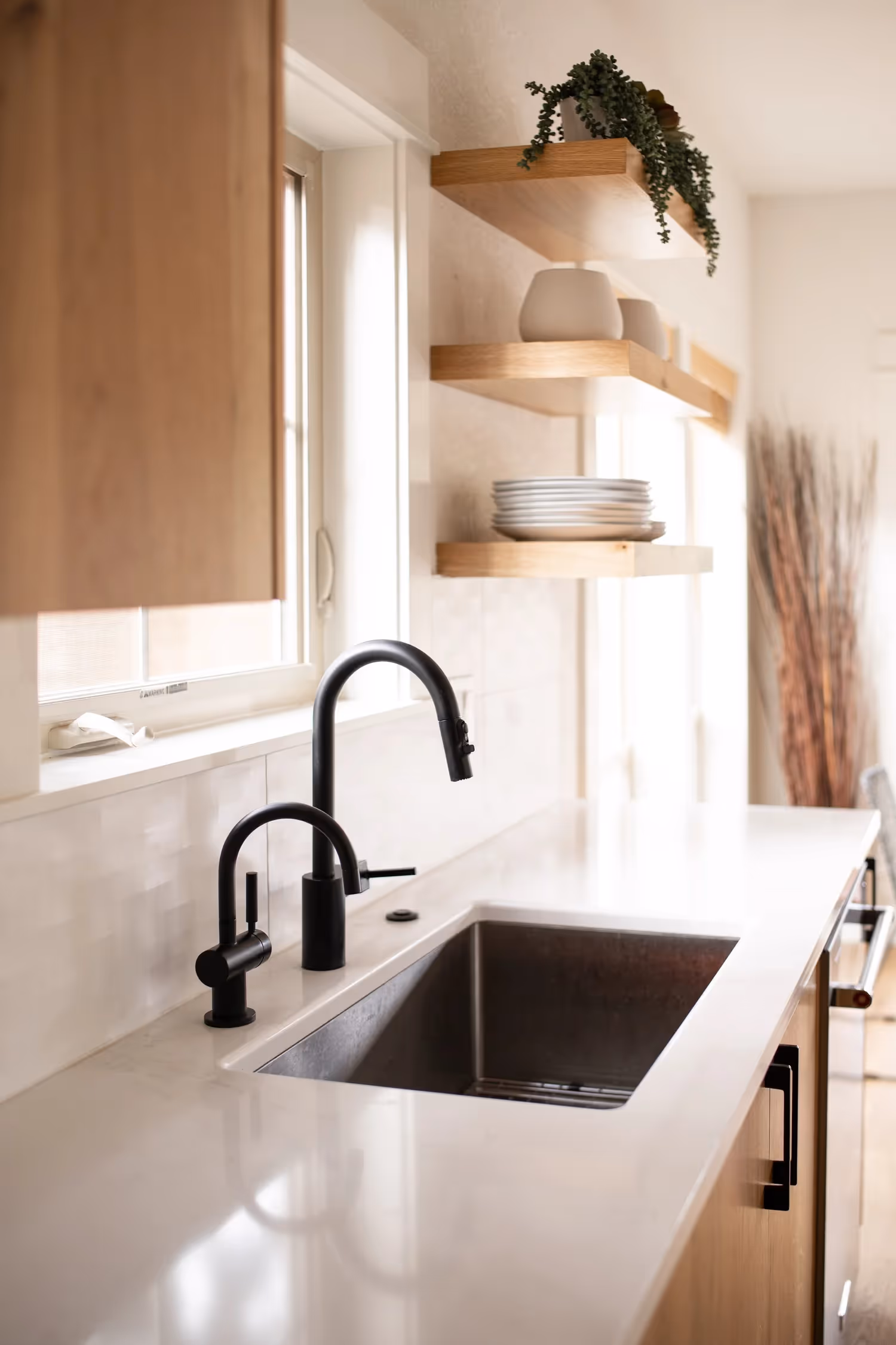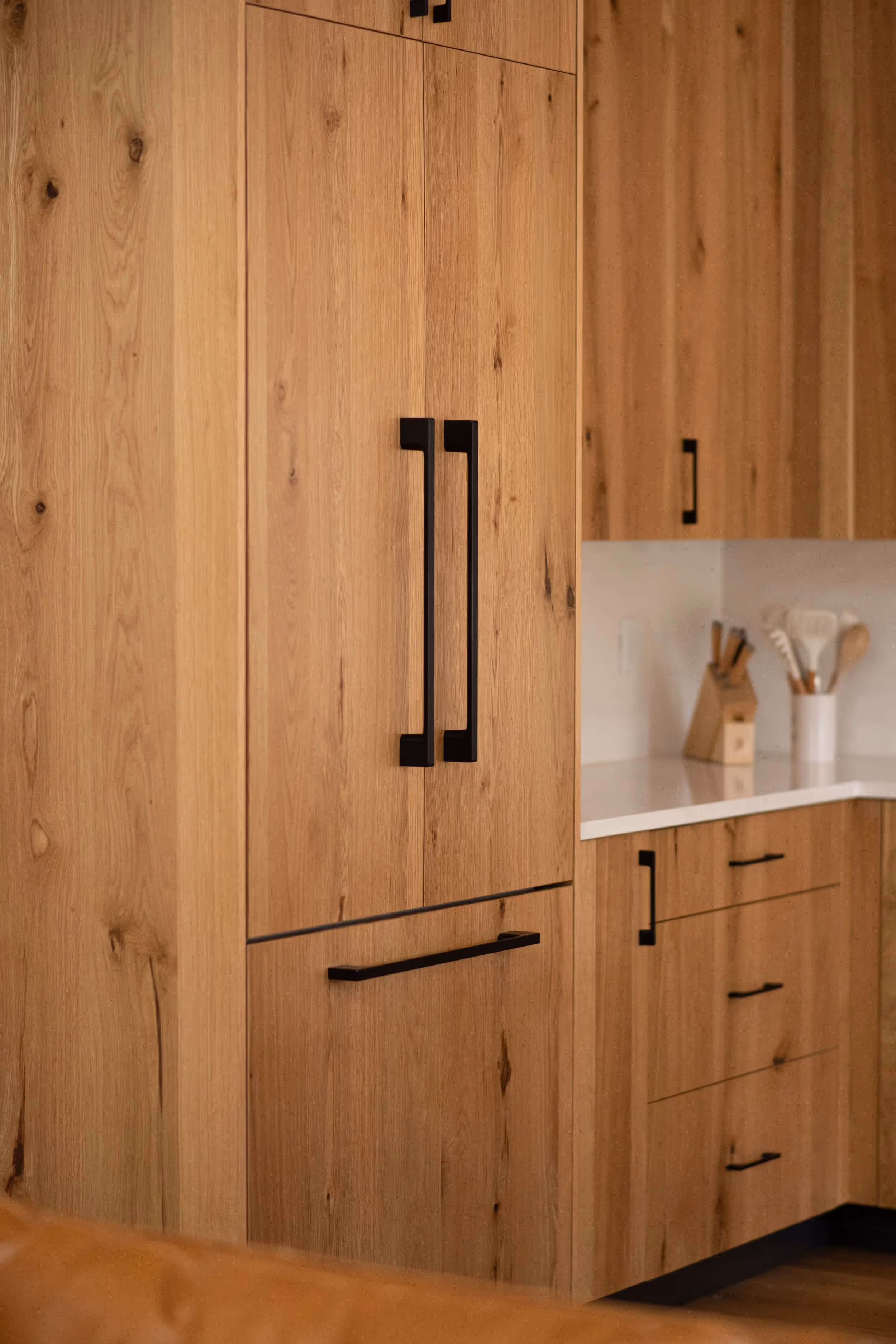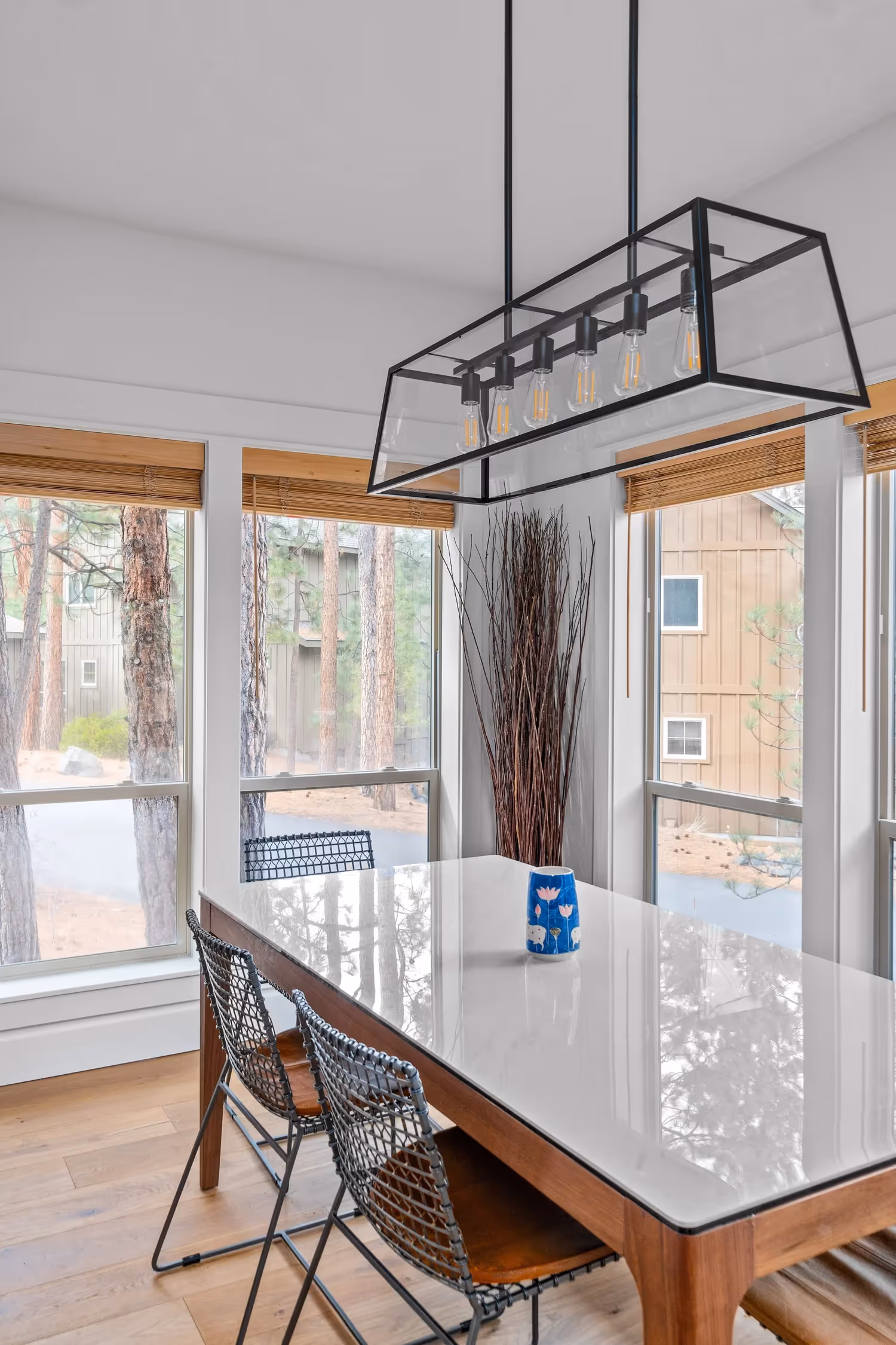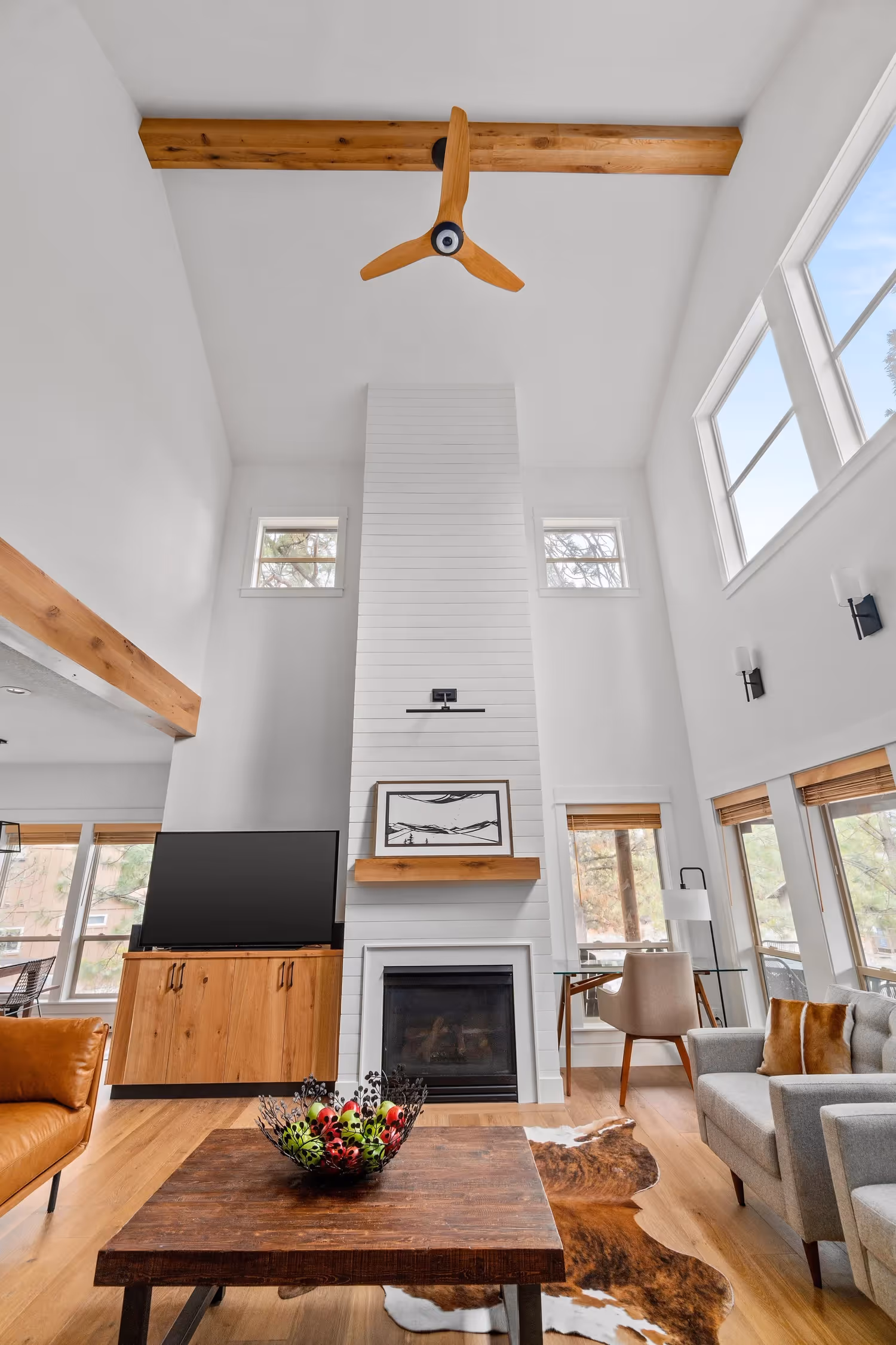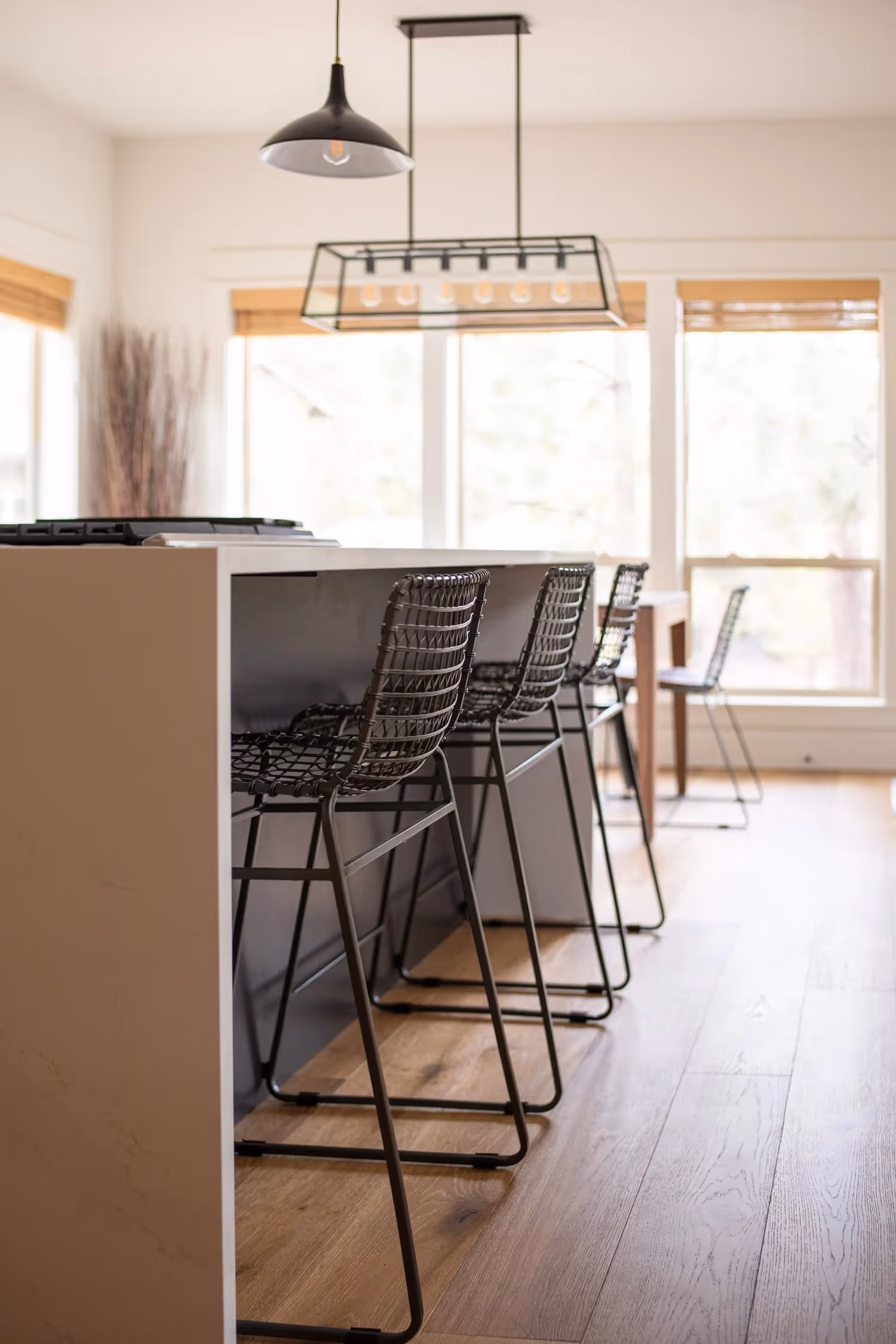 Balancing rustic warmth with a modern edge, this Mt. Bachelor remodel transforms the home into a harmonious blend of style and function. The kitchen boasts a reimagined layout with knotty white oak cabinetry, quartz countertops, and high-end stainless and cabinet-ready appliances. In the living area, an updated fireplace with a shiplap surround and custom built-in cabinetry brings cozy sophistication. The new office space above the main entrance is framed with custom wood trim and steel railings, adding architectural interest. Custom wood beams and a re-envisioned primary bath, complete with a walk-in shower and dual shower heads, enhance the home's cohesive, refined aesthetic.