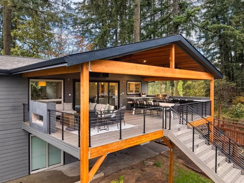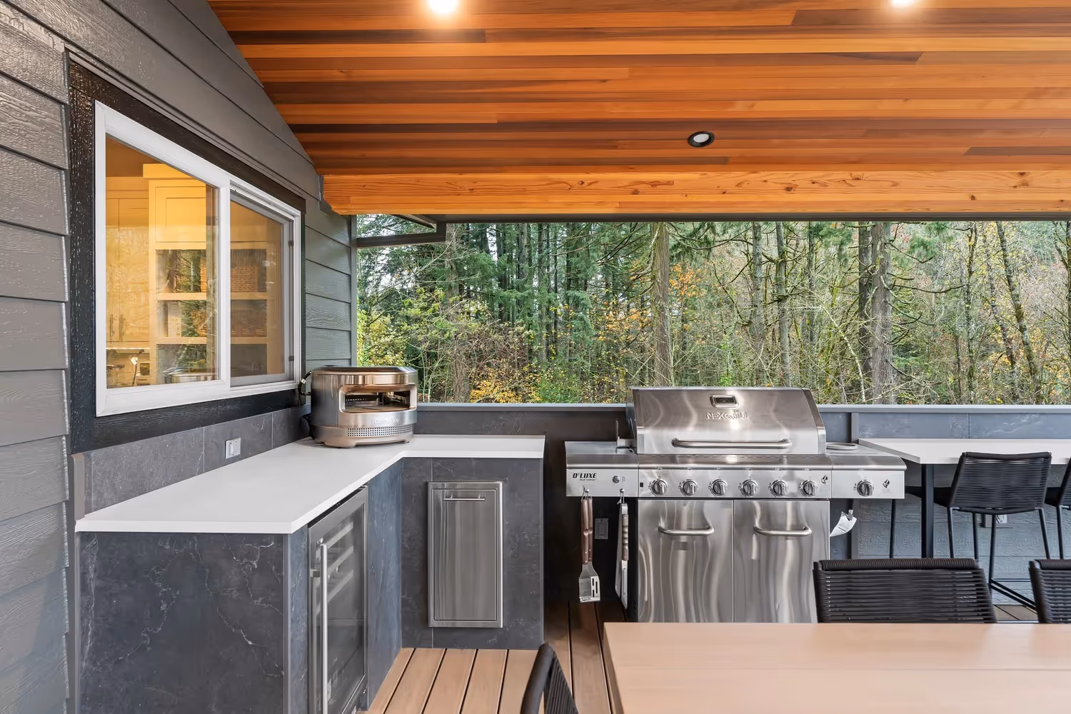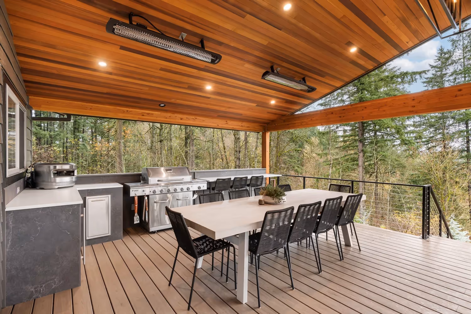 Under the serene canopy of Wilsonville’s towering trees, the Newland Rd. deck addition redefines outdoor living with elevated design and purpose. Featuring a rich cedar-lined tongue-and-groove ceiling, modern heating elements, and integrated lighting, this space becomes an inviting retreat in every season. The deck seamlessly blends form and function, including a built-in grill station, an expansive dining area, and a contemporary gas fireplace. Designed for both lively gatherings and quiet moments of reflection, it balances practical features with sophisticated style. Steel railings add a clean, modern edge while framing the natural beauty of the Pacific Northwest. This addition isn’t just about extending the home—it’s a testament to intentional craftsmanship that transforms outdoor spaces into timeless extensions of home life.