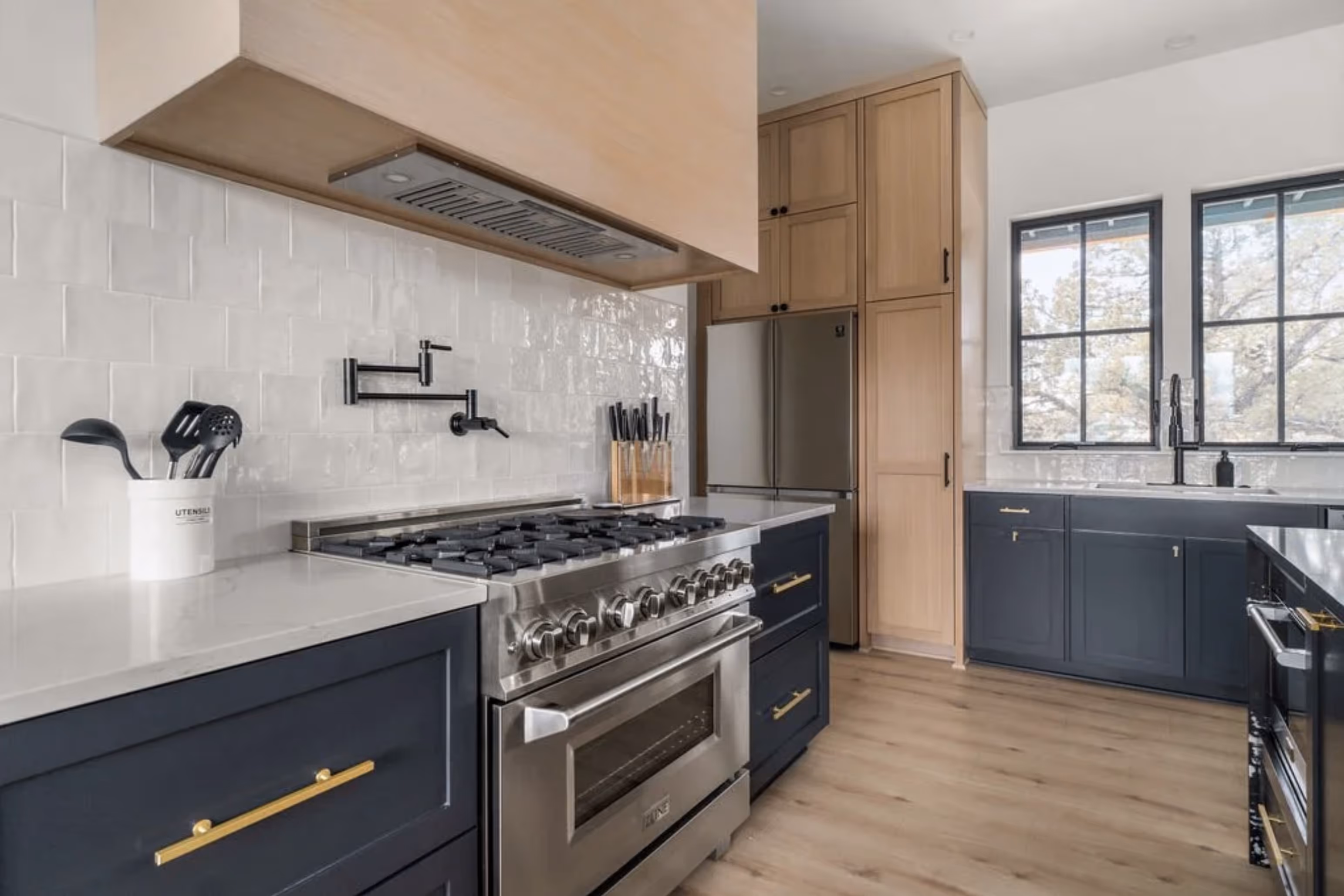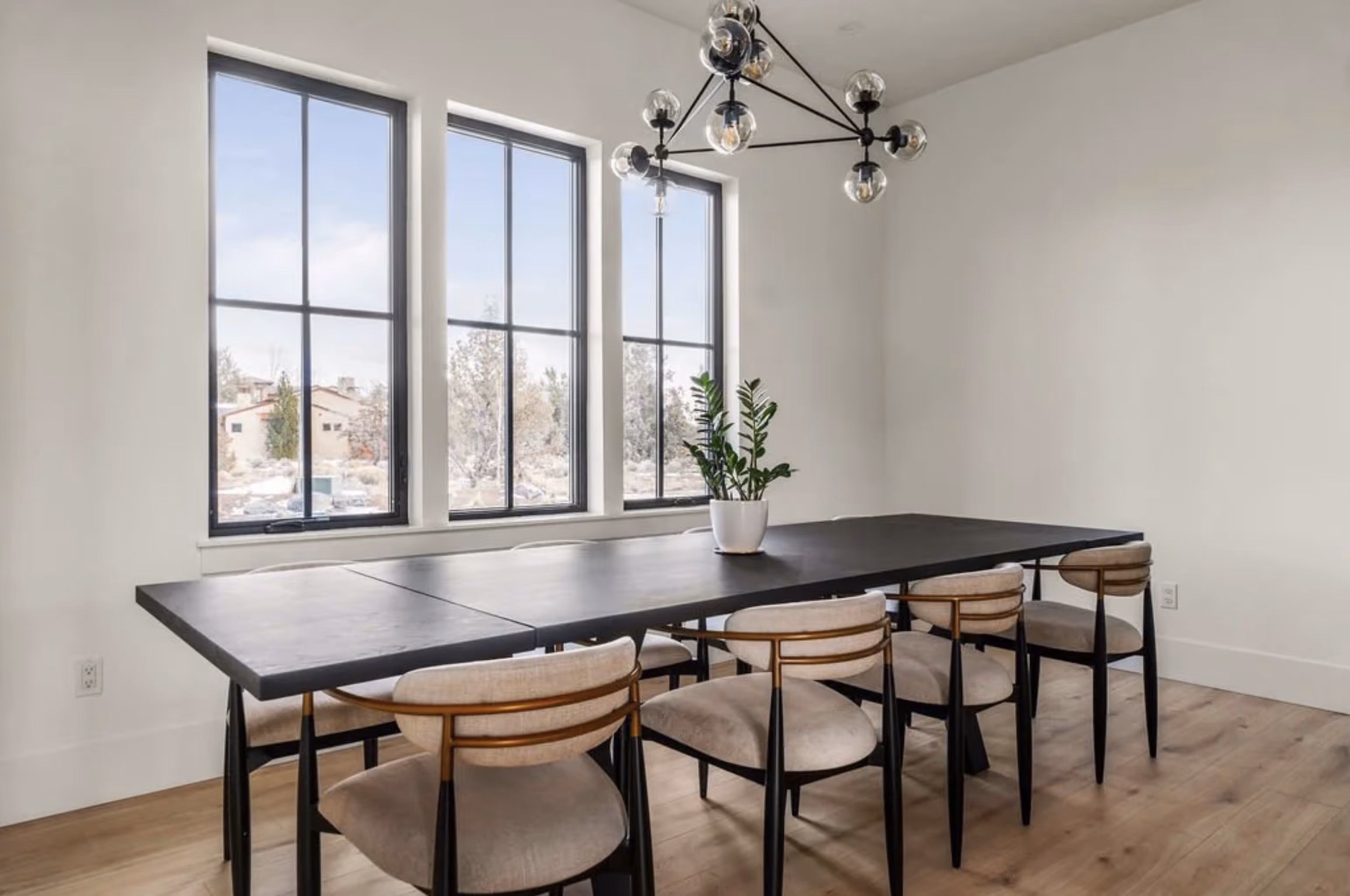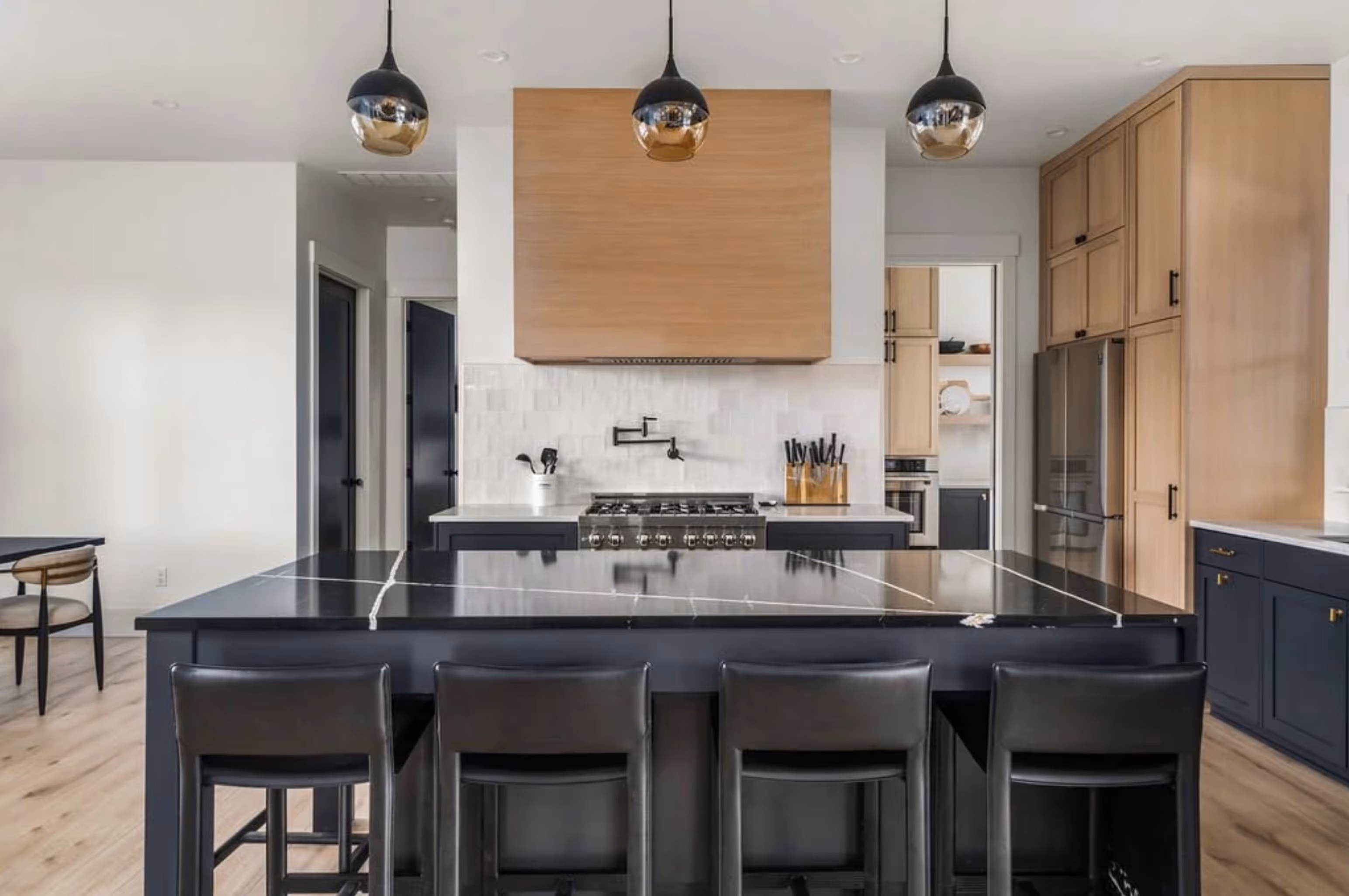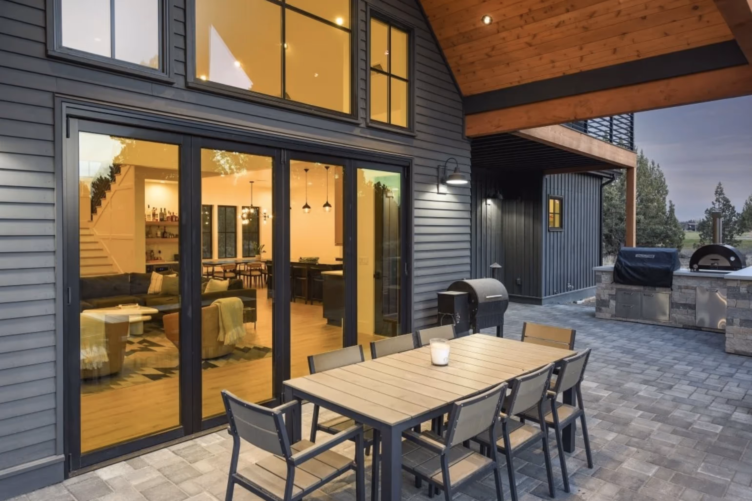 Nestled in the private Pronghorn golf community in Bend, Oregon, this custom-built contemporary home exudes modern luxury and functionality. Enter through custom double wood doors to discover a spacious interior featuring bifold collapsible patio doors for seamless indoor-outdoor flow. Highlights include a dedicated office above the garage, a sleek metal staircase railing, and a designer kitchen with a butler’s pantry and oversized wood range hood. The primary suite offers heated bathroom floors, a walk-in shower with dual heads, a stand-alone tub, and motion-sensor lighting on bathroom vanities. Outdoors, enjoy a covered seating area with cedar tongue-and-groove ceilings, zero-entry patios, and custom landscaping with paver driveways and patios, making this home the epitome of refined Bend living.