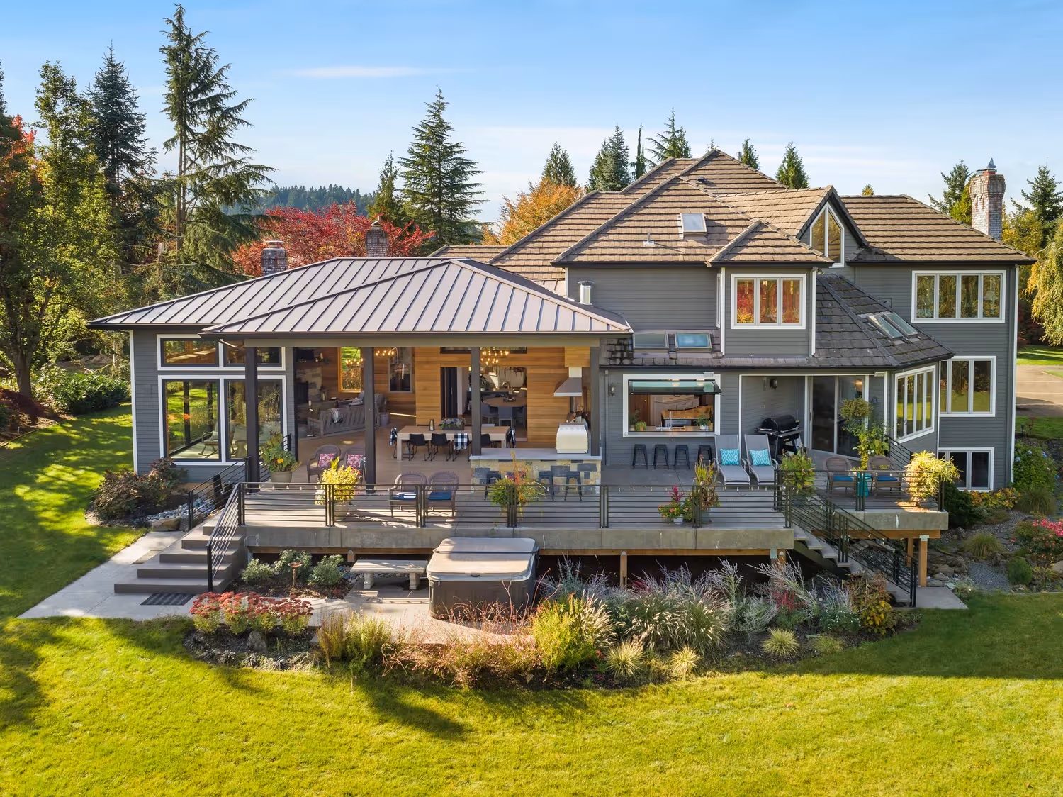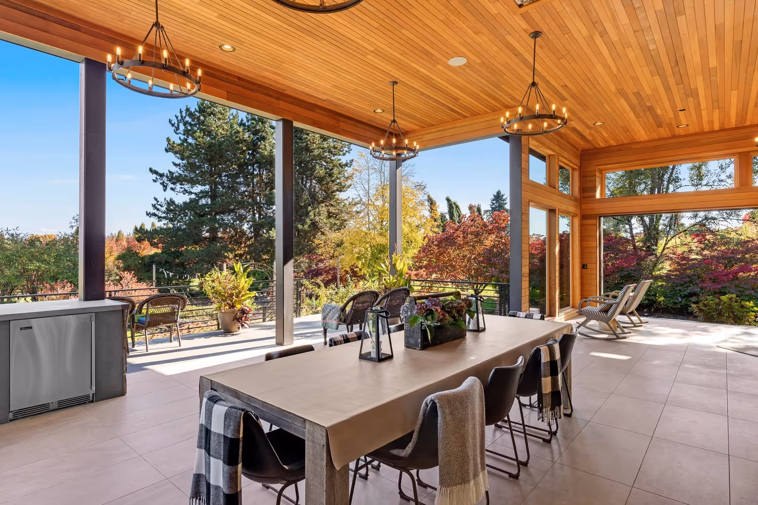 This addition and remodel transforms the home into a seamless indoor-outdoor entertaining space. A new kitchen and dining area open to an exterior living space with a hand-built wood-burning fireplace, cedar finishes, and built-in amenities designed for hosting.