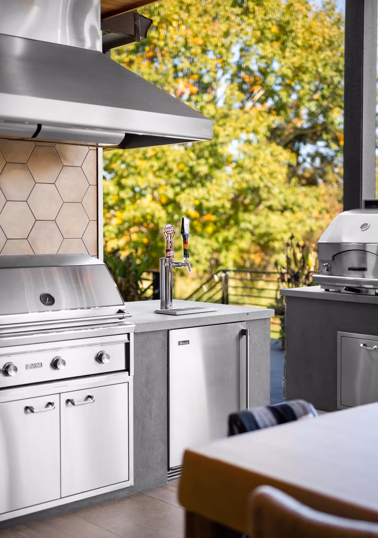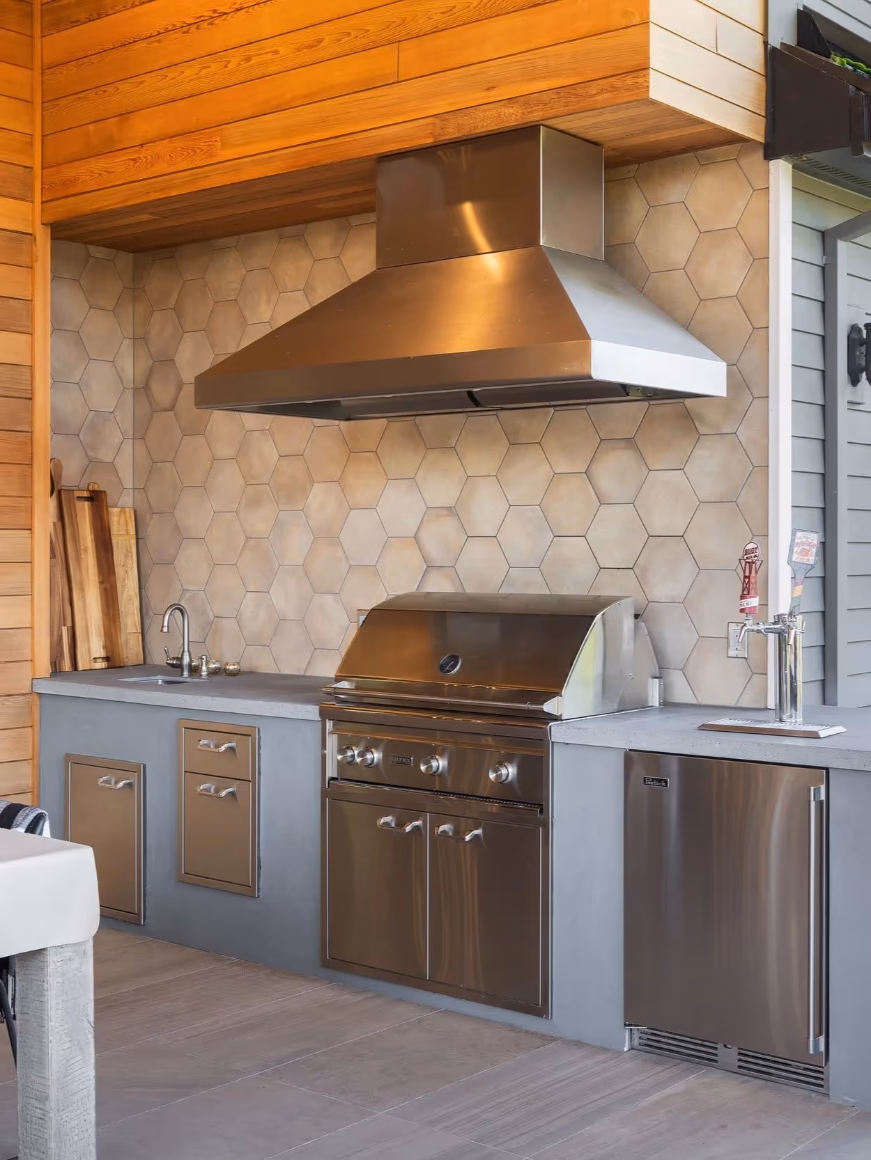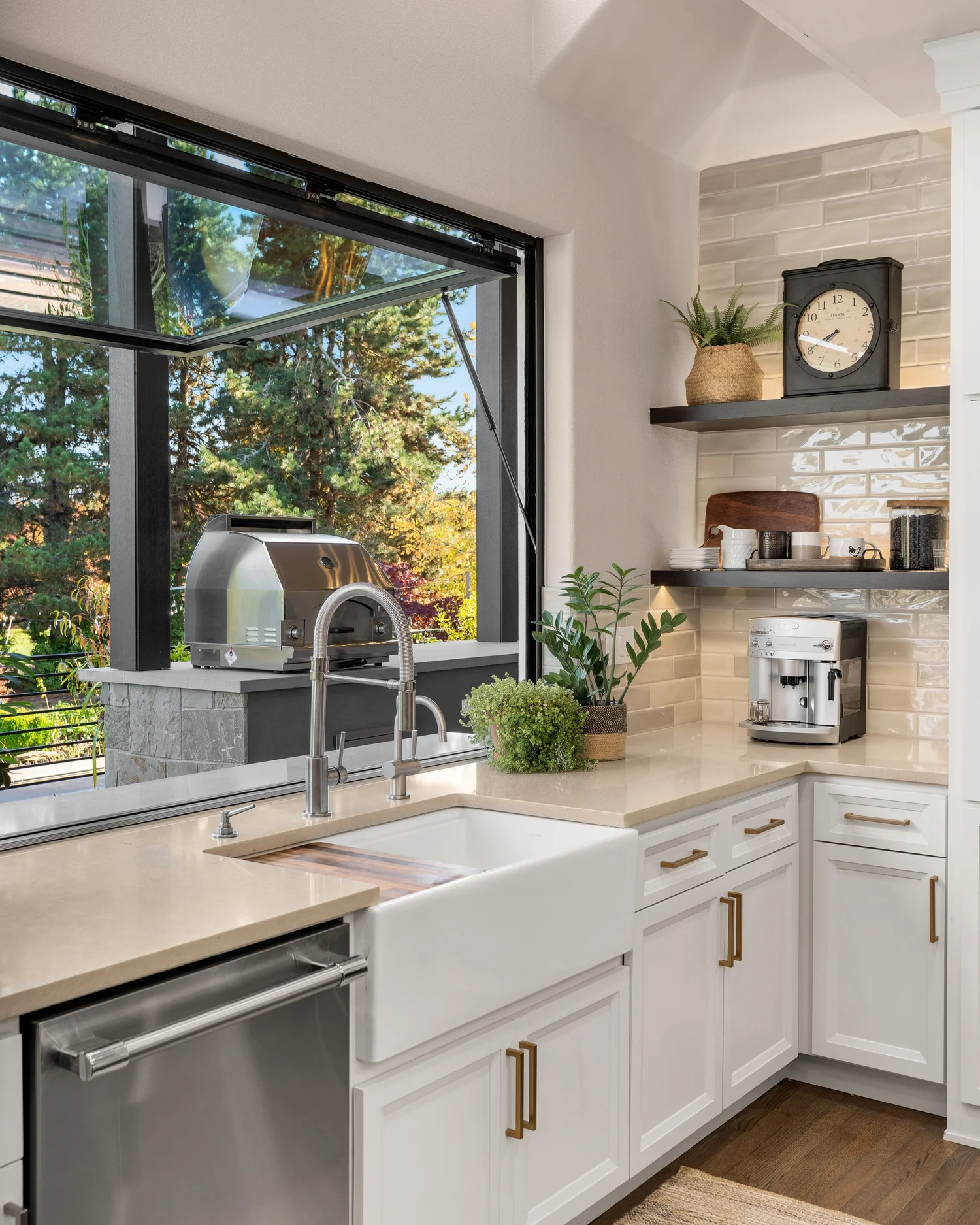 Inside, custom cabinetry, a farmhouse sink, and a statement metal hood are paired with expansive pocket sliding doors and a gas strut window to blur the line between indoors and out. The result is a warm yet refined space that showcases thoughtful design, skilled craftsmanship, and effortless flow.